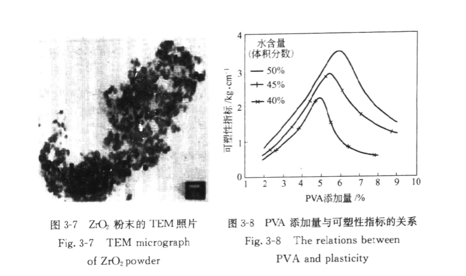 產(chǎn)生這一結(jié)果的原因應(yīng)歸功于泥團(tuán)內(nèi)毛細(xì)管力和高分子粘接力的變化。無PVA化時,顆粒之間的結(jié)合力只有毛細(xì)管力。PVA加入后,在毛細(xì)管力的基礎(chǔ)上疊加了高分子粘接力。PVA通通過它的羥基一OH與ZrO2表面產(chǎn)生配位鍵和氫鍵,將一個個ZrO2顆粒吸附在一起,PVA含量增加,吸附力增加,可塑性增加。