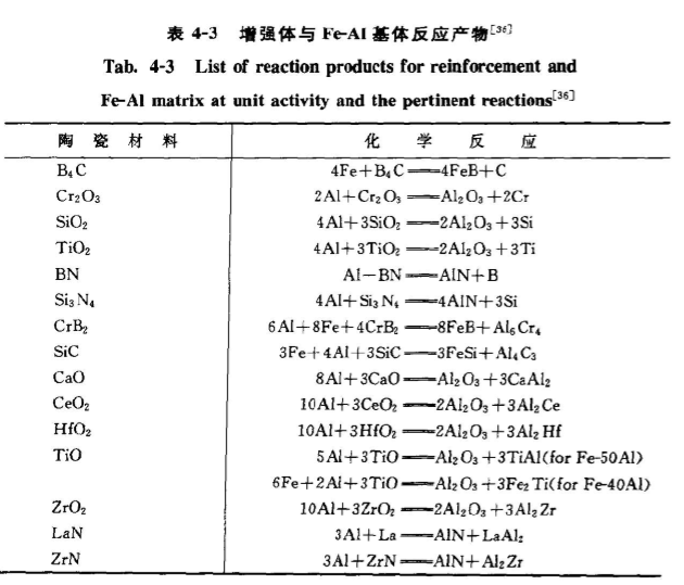 由表4-2可以看出,FeAI與A2O具有較好的適配性能,兩者之間無界面相形成。AAYK. MISRAZ在1990年也分析預測了以FeAl金屬間化合物為基體,陶瓷為增強體復合村料的熱動力學可能反應產物),分析結果見表4-3。上述結果對復合材料的設計也是非常重要的。