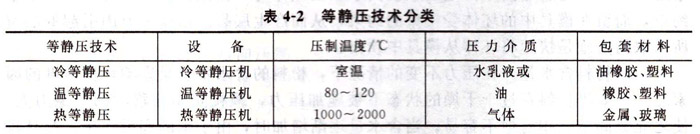 (2)等靜壓成型類型等靜壓技術(shù)按其成型和固結(jié)時(shí)溫度的高低,一般可分為三種:冷等靜壓(CIP)、溫等靜壓(WIP)和熱等靜壓(HIP)。由于等靜壓時(shí)溫度的差別,因此三種等靜壓技術(shù)分別采用了相應(yīng)的設(shè)備、壓力介質(zhì)和包套模具材料,如表4-2所示。