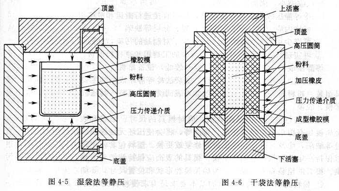 冷等靜壓又分為濕袋法和干袋法兩種等靜壓。濕袋法等靜壓是將粉料先放入成型模具(即包套)內(nèi),經(jīng)密封后再置于高壓缸中進(jìn)行壓制。在壓制過程中,包套完全浸入液體,與壓力傳遞介質(zhì)直接接觸。濕袋法等靜壓適用性強(qiáng),尤其適合用于實(shí)驗(yàn)研究和小批量生產(chǎn),并可同時(shí)在一個(gè)高壓缸內(nèi)壓制兩種以上不同形狀的制件及生產(chǎn)大型和形狀復(fù)雜的制件,生產(chǎn)流程短且成本低廉。濕袋法等靜壓的模具及坯料的放置方式如圖4-5所示。