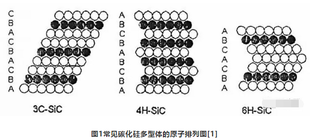 碳化硅以共價鍵為主,共價鍵約占88%。晶格的基本結構是互相穿插的SiC4和CSi4四面體。由于四面體堆積次序的不同形成不同的結構,至今已發現幾百種變體,常見的結構如3C-SiC、4H-SiC、6H-SiC等,堆積規律如圖所示。